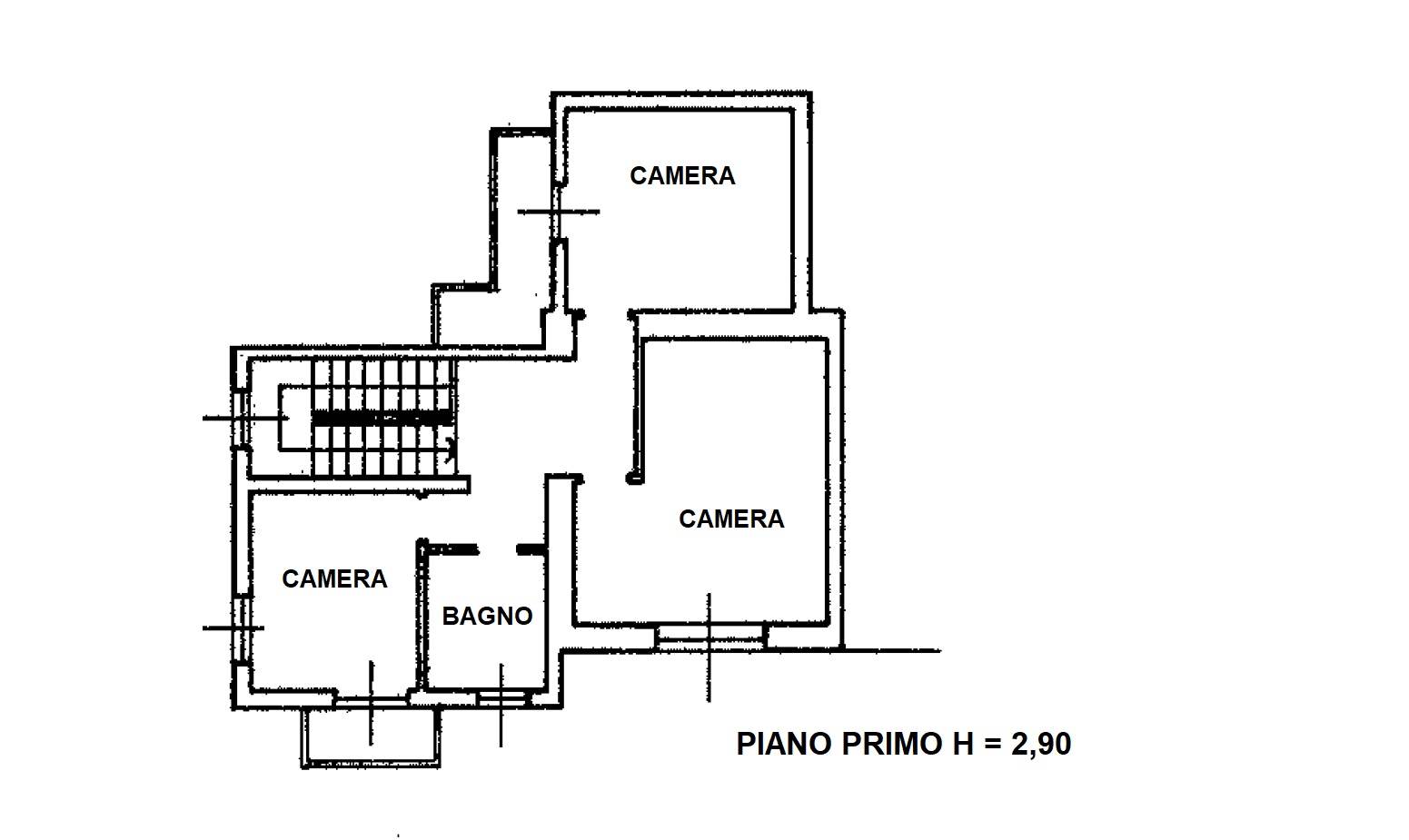 Al piano primo si sviluppa la zona notte composta da disimpegno, tre camere da letto, bagno e due balconi.